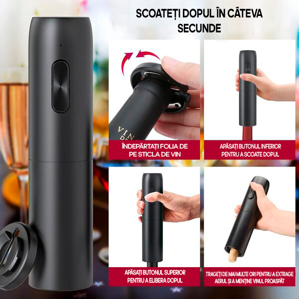 Deschizătorul nostru electric pentru sticlele cu vinuri nu este doar funcțional, ci și un accesoriu elegant pentru bucătăria sau barul dumneavoastră, având un design modern și elegant.