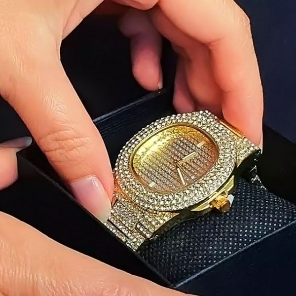 Mii de cristale strălucitoare transformă acest ceas într-un accesoriu captivant. Nu este doar un ceas – este o declarație îndrăzneață de lux și eleganță.
