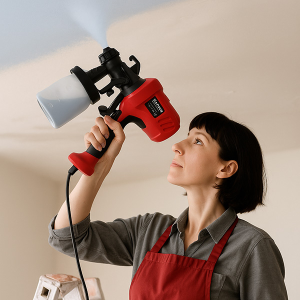 Duza specială produce o ceață fină de vopsea care se așază uniform, fără dâre sau pete. Unealta creează senzația că fiecare zonă se vopsește singură „așa cum trebuie”, indiferent de material, experiența utilizatorului sau direcția de mișcare.