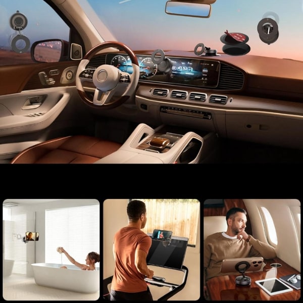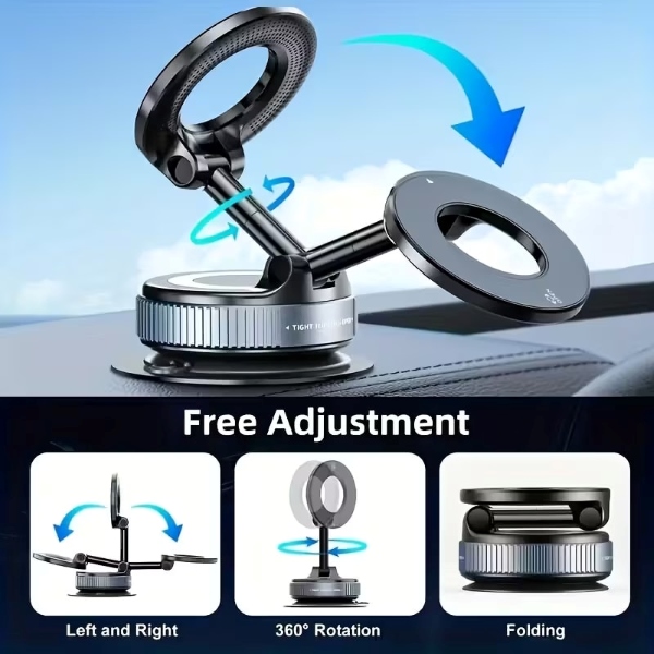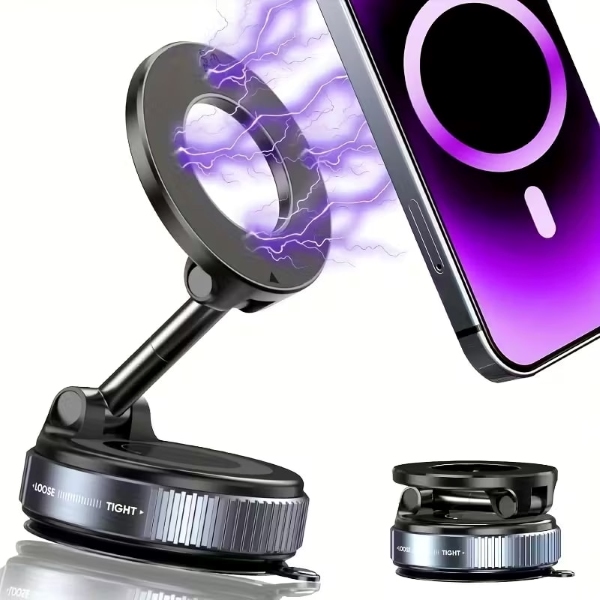Suportul pentru telefon MAGHOLDZ folosește o prindere puternică cu vid care se intensifică odată cu vibrațiile, menținând telefonul fix pe suprafețe netede fără a lăsa urme pe sticlă, bord sau birou.